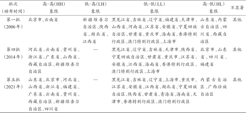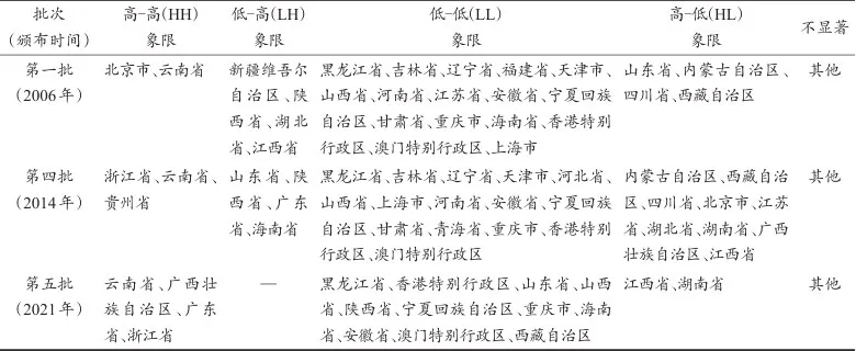 根据全局空间自相关Moran’sI累计计算的总变化趋势,并充分考虑相关政策颁布的时间节点,重点选取第一批、第四批和第五批国家级体育非物质文化遗产资源作为研究断面,并结合Moran’sI散点图中的体育非物质文化遗产资源象限分布情况,进一步应用局部空间自相关分析法分析我国国家级体育非物质文化遗产资源在时空演化过程中所呈现的不同区域间的空间异质性与稳定性。Moran’sI散点图展示了区域对象的标准化值与空间滞后向量之间的相关关系,可形成一个四象限的对比图(图1)和具体区域单元分布表(表2)。低-低(LL)象限是我国国家级体育非物质文化遗产资源低值区域被低值邻近区域包围,称为低速增长区;低-高(LH)象限是我国国家级体育非物质文化遗产资源低值区域被高值邻近区域包围,称为过渡区;高-高(HH)象限是我国国家级体育非物质文化遗产资源高值区域被高值邻近区域包围,称为扩散效应区;高-低(HL)象限是我国国家级体育非物质文化遗产资源高值区域被低值邻近区域包围,称为极化效应区。一般来看,位于低-低(LL)象限和高-高象限的我国国家级体育非物质文化遗产资源具有较强的空间相关关系,表明区域单元之间具有相似性、稳定性与集聚效应。位于低-高(LH)象限和高-低(HL)象限的我国国家级体育非物质文化遗产资源具有不稳定的空间相关关系,反映了区域单元之间的异质性。