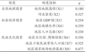式(7)中,q为影响因素指标对国家级体育非物质文化遗产空间分异的解释力度,数值越大表明指标对其空间分布的解释力越强,q∈[0,1];L为第h类影响因素的分类个数;Nh和σh2分别为第h类影响因素的单元数和方差;N和σ2分别为国家体育非物质文化遗产资源的样本量和方差。