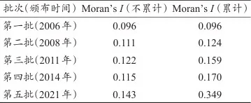 第一批国家级体育非物质文化遗产资源Moran’sI为0.096,接近于0,说明第一批国家级体育非物质文化遗产资源的全局空间自相关性较弱,分布比较随机,没有明显的区域集聚现象。直至第五批次累积后,Moran’sI不断升高,从0.096上升到0.349(表1),此时我国国家级体育非物质文化遗产资源已经呈现出比较显著的、稳定的区域集聚特征。但是如果从不累计计算每一个批次的Moran’sI来看,Moran’sI并没有呈现出逐步升高的趋势,即每一个批次的全局空间自相关性有一定的差异。相对地,不累计计算的第五批Moran’sI最高,达到0.143,但是全局自相关性较弱,只能在一定程度上呈现出区域集聚特征,其他批次的Moran’sI相对更低,全局空间自相关性都比较弱,所呈现出的区域集聚性特征不够明显。